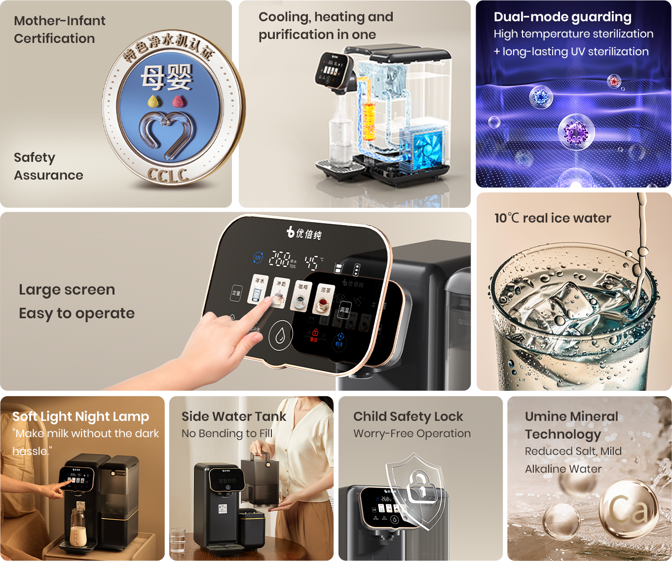 This hot and cold all-in-one machine provides mother and baby certified pure water, supports hot and cold dual water dispensing and one-touch direct drinking. It has dual modes of high temperature disinfection and UV sterilisation to ensure safe water quality. The large colour screen is easy to operate, the side-mounted water tank is free of bending, and the soft night light is more convenient to use at night. Safe child lock design, Umine mineral living technology to provide weak alkaline water, care for the health of the whole family.