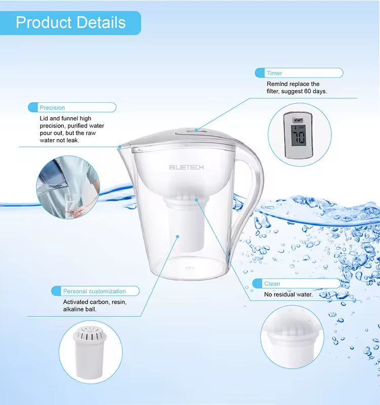 This Top Selling 10 Cup Alkaline Water Filter Pitcher focuses on the healthy drinking needs of families by converting ordinary tap water into alkaline water through the built-in filter cartridge. Core features include an electronic cartridge replacement indicator, multiple filtration technologies, and a convenient water storage design for everyday drinking and cooking.